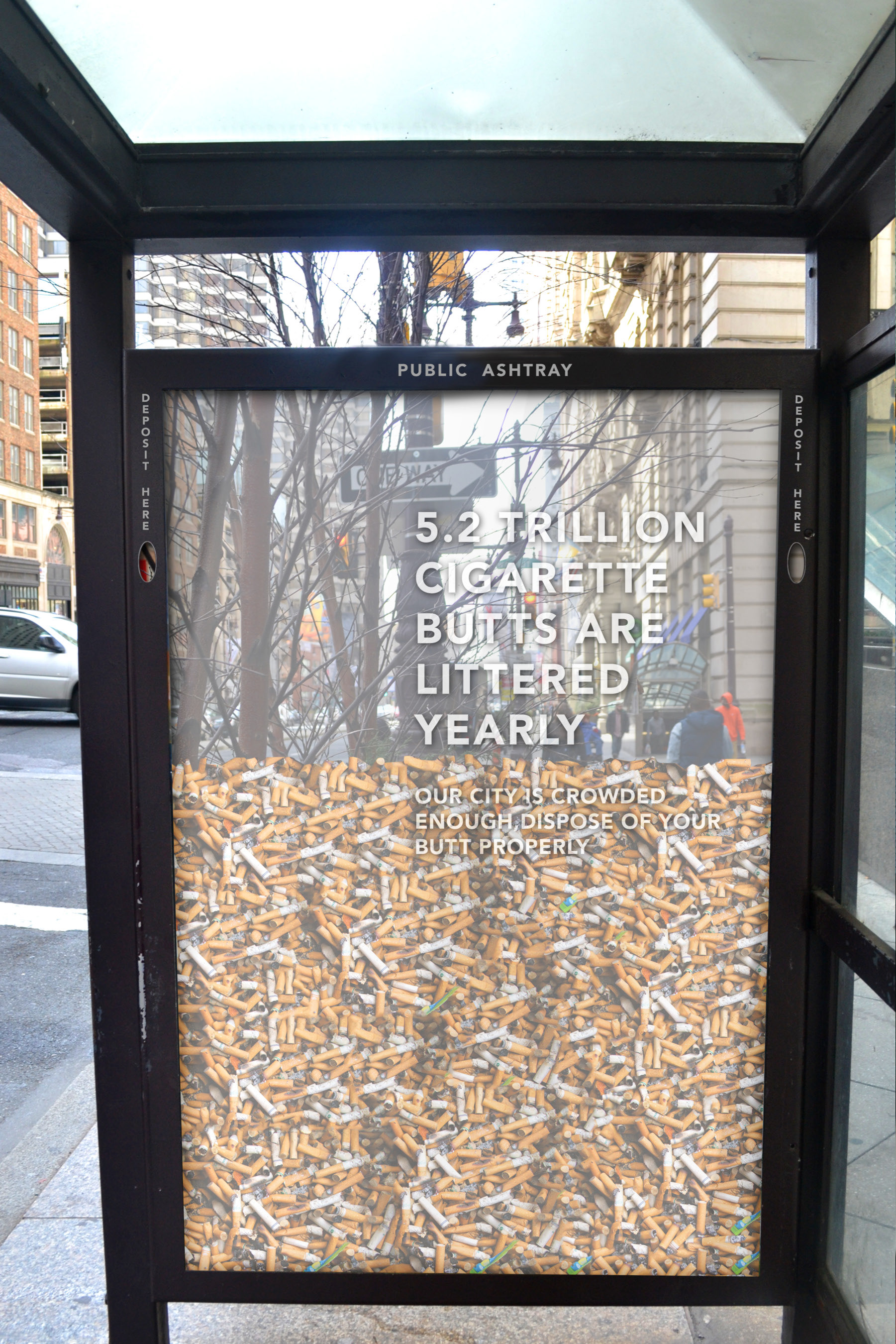 A variety of everyday interactions which are meant to stimulate behavior of appropriately disposing of cigarette filters.